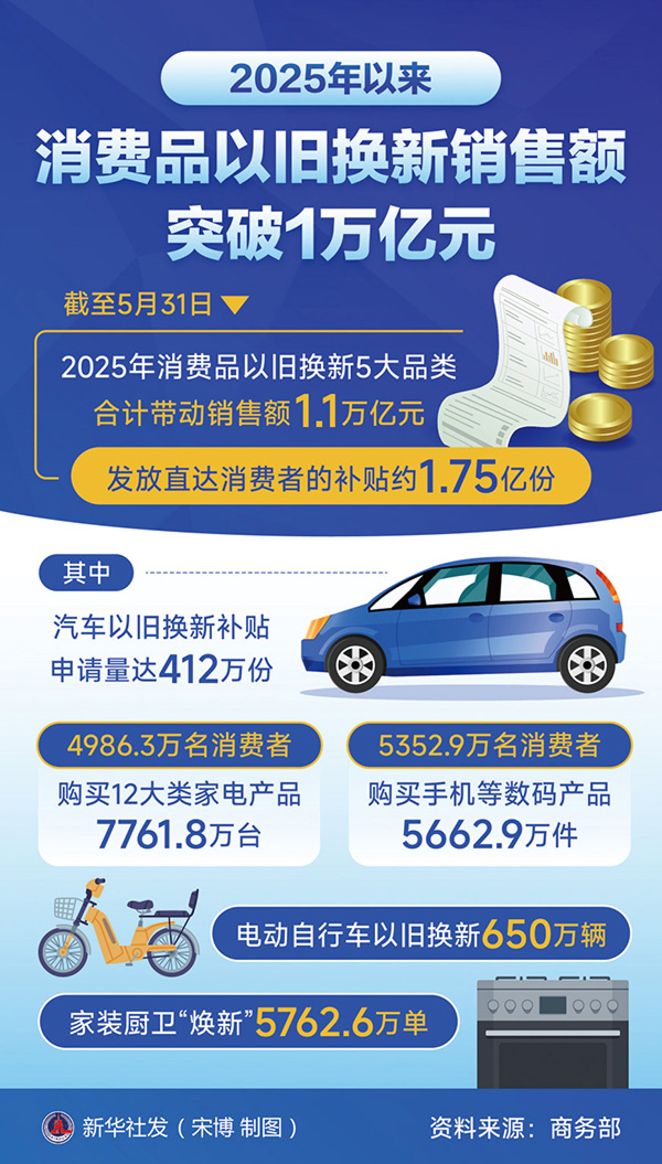 开展新一轮消费品以旧换新,是扩大无效需求、通顺经济轮回的主要行动。截至5月31日,2025年消费品以旧换新5大品类合计带动发卖额1。1万亿元,发放中转消费者的补助约1。75亿份。 发 宋博/制图。